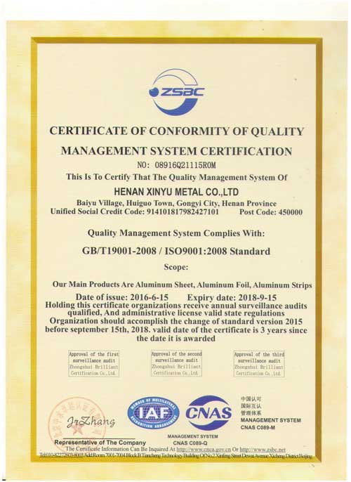 Somos un fabricante profesional de aluminio en China con una subsidiaria de Henan Xinchang Import and Export Trade Co., Ltd, que está a cargo de las ventas en el extranjero. Henan Xinyu Non-ferrous Metals Co., Ltd está especializada en la fabricación de láminas, bobinas, placas y láminas de aleación de aluminio de la serie 1 a la serie 8, etc.